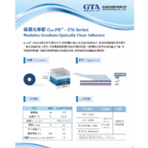 OpticPB™ 576系列適用於手機或大尺寸觸控顯示器之光學構件的全貼合,彈性梯度膠體展現出優於一般光學膠的加工特性,內部高彈模膠體具傑出的機械強度,可提高貼合良率及易於重工作業•外部低彈模膠體,可避免液晶模組貼合後產生異色,並具優良的油墨斷差填補性。